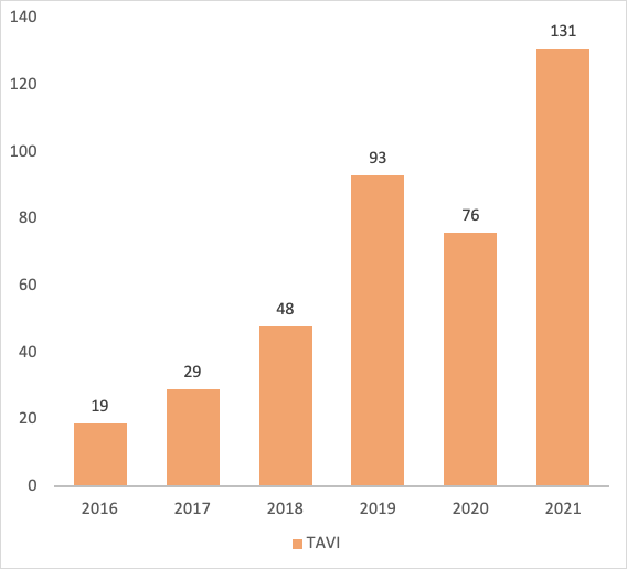 De voorbije twee jaar zette de COVID-pandemie het zorgsysteem enorm onder druk en zorgde ze voor uitstel van heel wat niet-COVID-gerelateerde zorgverlening. Ook de behandeling van patiënten met een vernauwde aortaklep kwam in 2020 in het gedrang, zoals te zien is in de grafiek (*). Deze aandoening is te behandelen via openhartchirurgie, maar ook via kathetertechniek: Transcatheter Aortic Valve Implantation, kortweg TAVI. Op campus Sint-Jan past het TAVI-team deze techniek steeds vaker toe, met een recordaantal van 131 keer in 2021.